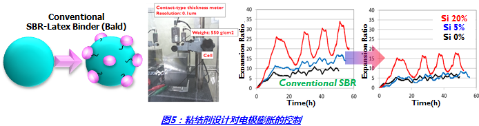 对电池膨胀的影响:对粘结剂粒子表面单体成分控制,并进行表面改性,从而达到对活性物与金属有极好的粘接力,抗电解质化学稳定性,浆料中胶体的稳定性。加上对粘结剂本身的延展性(Strain)和强度(Stress)的控制,可达到抑制电极膨胀目的。