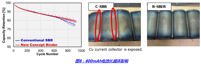 对循环性能的影响:粘结剂粒子的耐电解液特性提高,强度及弹性随时间变化减少,粘结力才能够得到长期保障。特别是在长期循环的情况下,越发能够体现对粘结剂弹性及耐久性的考验。