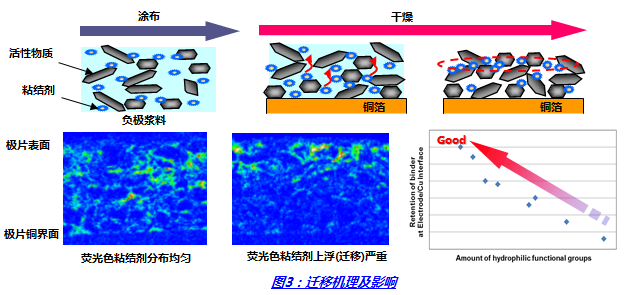 对迁移抑制的影响:粘结剂是有机化学品,悬浮于水中呈液态乳液状。添加在浆料中并涂布在极片上,为提升生产效率,一般会对烘干温度进行提升(传送速度快)来满足生产,温度高时水分的蒸发速度更快,因此悬浮的粘结剂会快速的迁移至极片表面,造成Cu界面粘结剂缺失,特别是在辊压时引起粘辊或脱粉,掉料等现象。
