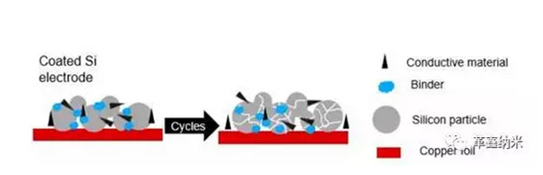 另外,完整的表面包覆非常重要,防止硅和电解液接触,产生厚的SEI膜的消耗。微观结构的设计也很重要,要来维持在循环过程中电子的接触,离子的通道,体积的膨胀。