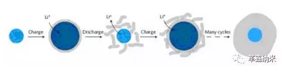 碳包覆机理在于:Si的体积膨胀由石墨和无定形包覆层共同承担,避免负极材料在嵌脱锂过程因巨大的体积变化和应力而粉化。碳包覆的作用是: