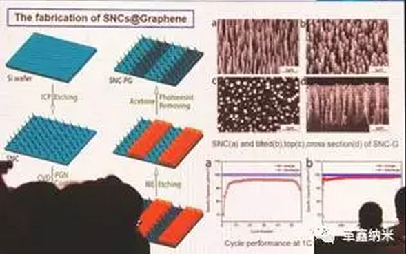 石墨表面因为导电性特别好,相对来说SEI膜比较均匀,它的组成跟硅负极不一样。为了研究这个问题,中科院相关科学家做了模型材料,通过微加工做成硅纳米柱。观察这种材料在充放电过程中SEI膜的生长,我们发现随着循环次数的增加,SEI膜逐渐把硅柱中间的空隙填上,覆盖完后还会继续生长大概4.5μm,在硅表面如果不加任何处理,SEI膜可以长得很厚。这说明它是多孔的,溶剂始终能够接触到浸到硅的表面,这样在全电池设计时是不行的。怎么样解决这个问题,中科院科相关学家做了一些尝试在硅上做了碳包覆,为了做对比,我们硅上只做了部分的石墨烯包覆,其他地方空出来。最终看到包覆和不包覆SEI膜的生长情况不一样,碳包覆的SEI膜就明显减少,没有包覆的SEI膜就有很多。