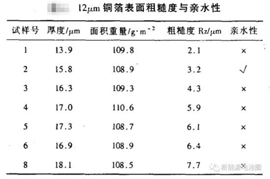 通过扫描电镜(SEM)可以发现,亲水性好的铜箔,其晶粒细密,表面粗糙度相对较低。表面粗糙度低的生箔,经表面处理后其亲水性仍旧良好。这主要由于电解铜箔的球团晶粒越细,其真实比表面积就越大;而表面粗糙度越大,其真实表面积反而越低,导致铜箔亲水性降低。