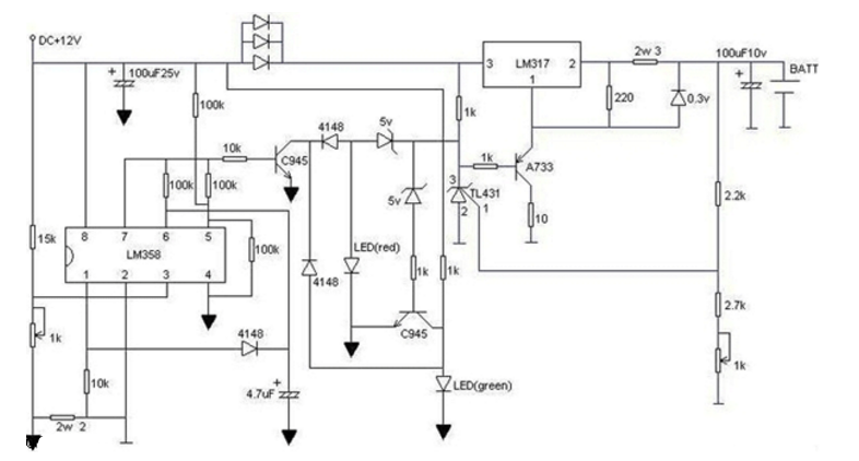 本电路带充电状态显示功能,红灯闪正在充,绿灯闪马上要充满,绿灯亮完全充满。只要您有12V的电源就可以,接完电路后先别装电池,调右下角的可调电阻,使电池输出端为4.2V,再调左下角的可调电阻使LM358第三脚为0.16V就可以了,充电电流为380mA,超快,三个并连的二极管是降压的,防止LM317过热,且LM317须加散热片,图中的三极管可以任意型号。