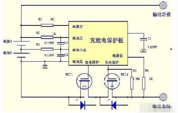 由两个场效应管和专用保护集成块S--8232组成,过充电控制管FET2和过放电控制管FET1串联于电路,由保护IC监视电池电压并进行控制,当电池电压上升至4.2V时,过充电保护管FET1截止,停止充电。为防止误动作,一般在外电路加有延时电容。当电池处于放电状态下,电池电压降至2.55V时,过放电控制管FET1截止,停止向负载供电。过电流保护是在当负载上有较大电流流过时,控制FET1使其截止,停止向负载放电,目的是为了保护电池和场效应管。