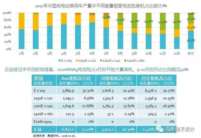 电池能量密度与补贴挂钩是从去年开始的。去年的补贴政策是电池包120Wh/kg以上的可以获得1.1倍的补贴系数。企业经过了半年的准备之后,开始规模化推出使用120Wh/kg以上电池包的纯电动乘用车产品,而且量在迅速增大,9月以后的4个月,120Wh/kg以上电池包装机量占比都稳定在40%以上,发展速度让人惊讶。这种速度超出了能够正常理解的范畴,也让人感觉有点担忧车辆及电池包的安全系数是否能保持。