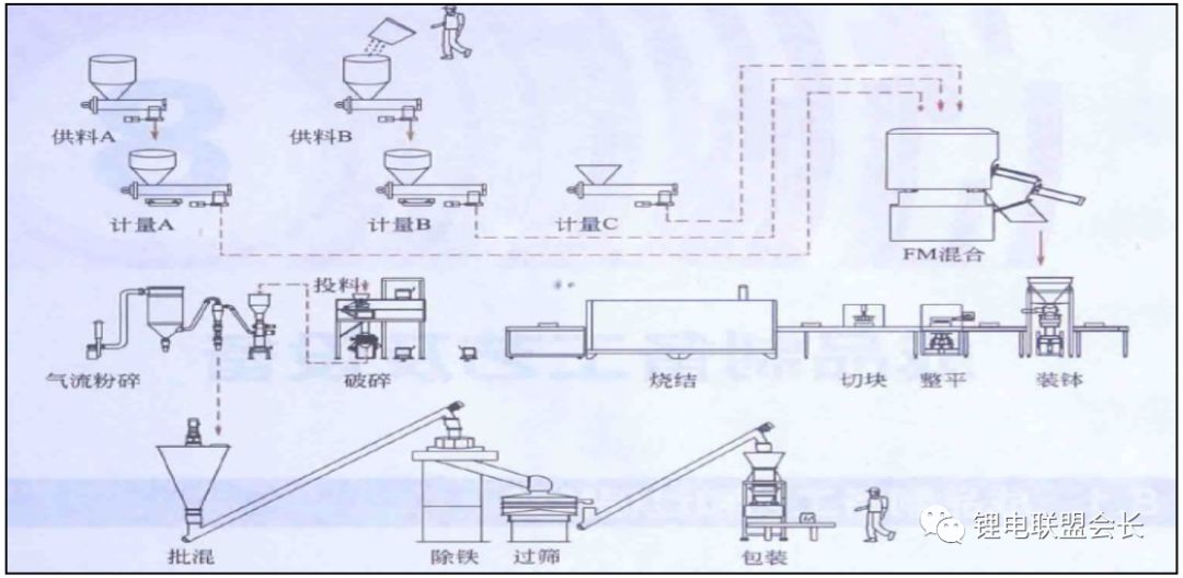 关于锂离子电池材料工业化制造、批量化生产系列,本文主要介绍正极材料的相关的合成方法以及相关技术手段,相比较其他三大主材,正极材料的工业化生产工序较多,合成路线也相对比较复杂,对温度、环境、杂质含量的控制也比较严格,正极材料主要有钴酸锂、锰酸锂、磷酸铁锂、三元材料等,由于目前市场上能量密度高的动力电池正极材料均是不同配比的三元材料,所以本文就以三元材料入手,开始介绍材料的工业化生产方法。