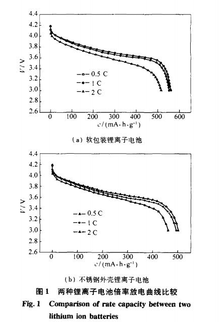 图1是两种锂离子电池的倍率放电曲线图,其中C为电池容量,为电压,电池在测试开始前经过1C(500mA)电流充电至4.2V,并在此电压下继续恒压充电2h,之后静置2h.