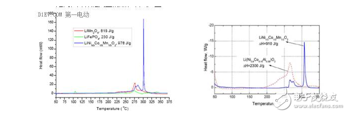 不同的正极材料,其活性物质分解所产生的热量是不同的,所释放的氧气含量也有所不同。磷酸铁锂正极材料由于分解时产生的热量较少,因而在所有的正极材料中,热稳定性最为突出。镍钴锰三元材料分解时则会产生较多的热量,同时伴有大量的氧气释放,容易产生燃烧或爆炸,因此安全性相对较低。