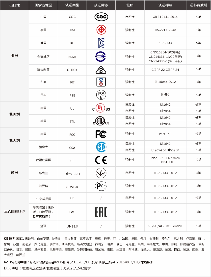 全球主要国家和地区认证明细(电池产品类)